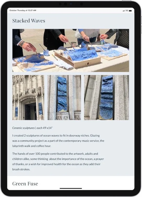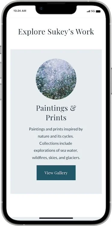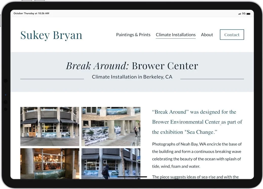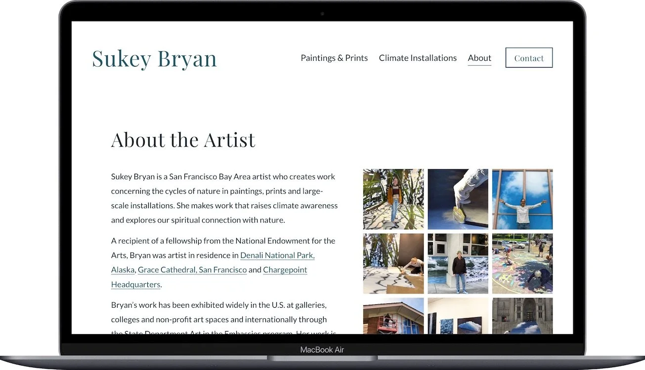 Sukey Bryan is a full-time artist, based in the San Francisco Bay Area, who creates internationally exhibiting work drawn from the cycles of nature. Her website includes collections of paintings and prints, as well as a portfolio of immersive, in-person, public installations. The website is specifically designed to showcase the scale and beauty of her work.